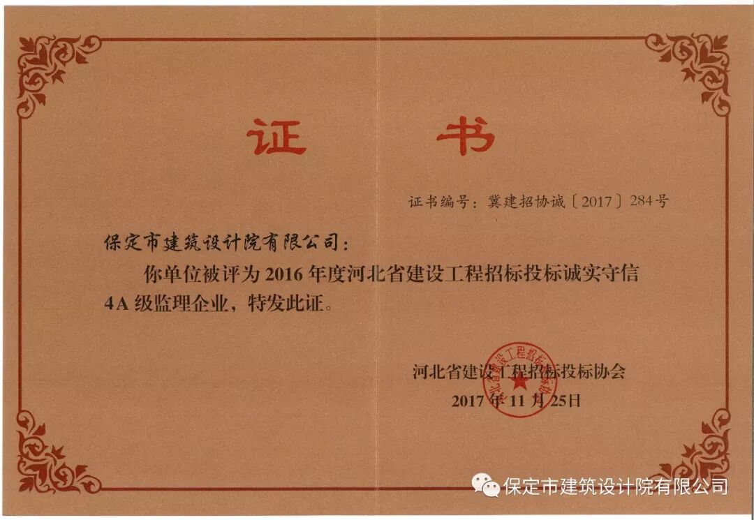为了进一步鼓励并引导招标代理机构、投标企业及从业人员遵纪守法、诚实信用、公平竞争,增强企业法律意识、信用意识,营造经营的良好市场环境,河北省建设工程招标投标协会组织开展了“2016年度河北省建设工程招标投标诚实守信单位”评选活动。经河北省建设工程招标投标协会专家委员会评审,我公司榜上有名。
